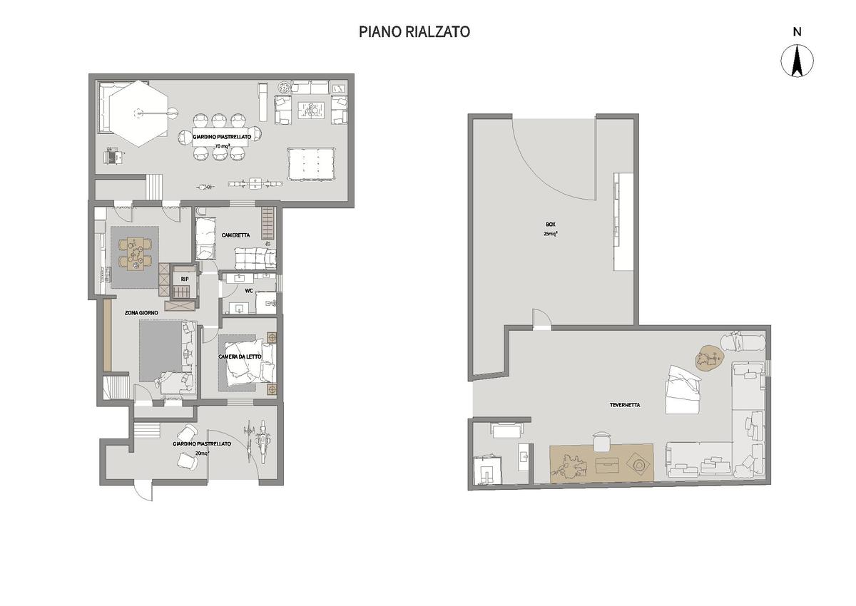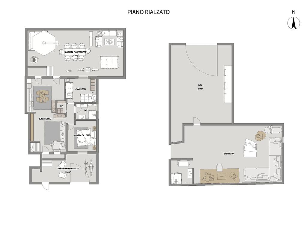 L’immobile, con ingresso indipendente,si apre su un giardino piastrellato di circa 20 mq e si sviluppa con un’ampia zona giorno, caratterizzata da doppia esposizione e con accesso diretto sia al giardino d'ingresso sia a un secondo giardino piastrellato posteriore di circa 70 mq, ideale per momenti di relax o convivialità all’aperto.